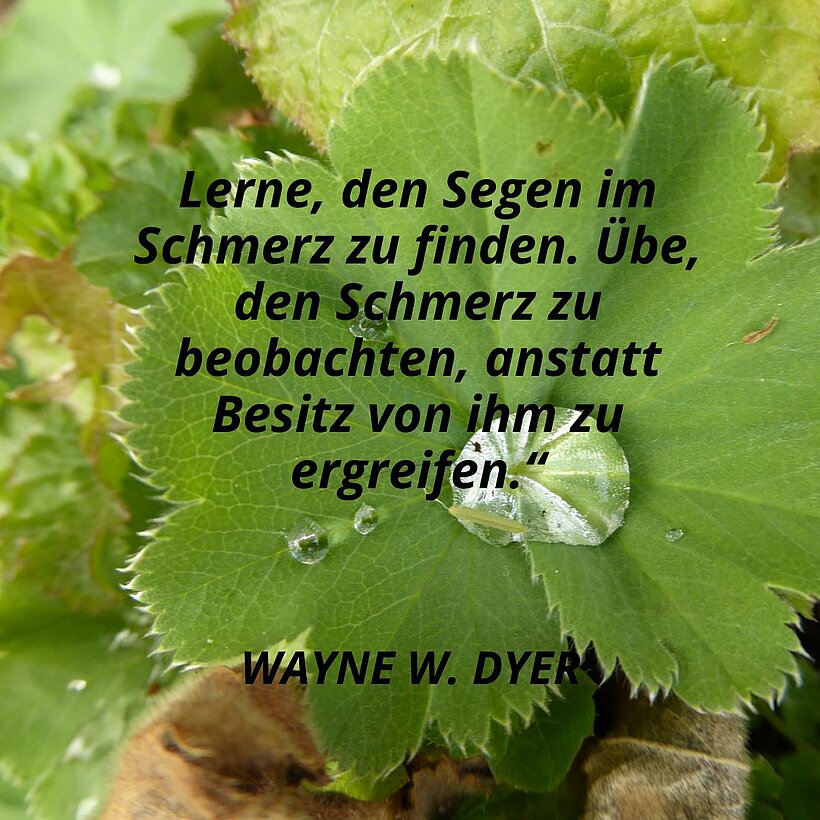 Eine andere Teilnehmerin erinnerte sich an einen passenden Meditationsspruch von Wayne W. Dyer. In seinem Buch „Du bist, was du denkst“ schreibt er: „Lerne, den Segen im Schmerz zu finden. Übe, den Schmerz zu beobachten, anstatt Besitz von ihm zu ergreifen.“